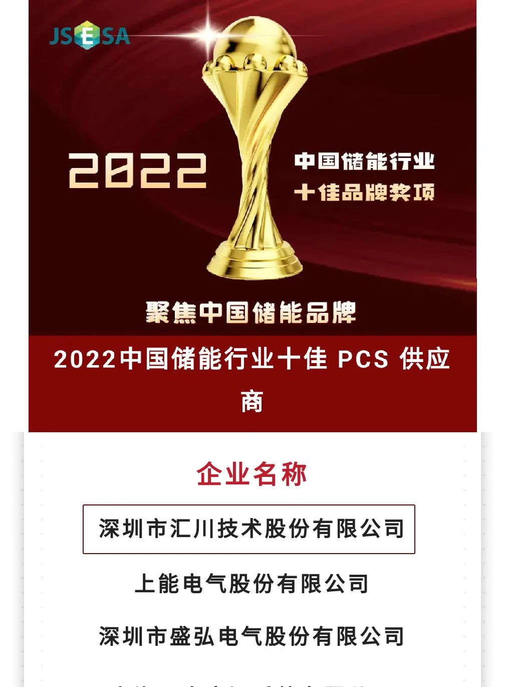 不久后,由中國(guó)(江蘇)國(guó)際儲(chǔ)能大會(huì)組委會(huì)與江蘇省儲(chǔ)能行業(yè)協(xié)會(huì)主辦的“2022中國(guó)儲(chǔ)能行業(yè)十佳品牌”系列獎(jiǎng)項(xiàng)公益評(píng)選活動(dòng)中,匯川技術(shù)在數(shù)百家企業(yè)海選中脫穎而出,成功入圍“2022中國(guó)儲(chǔ)能行業(yè)十佳PCS供應(yīng)商”。接連斬獲儲(chǔ)能最佳供應(yīng)商獎(jiǎng)項(xiàng),不僅是對(duì)匯川技術(shù)研發(fā)創(chuàng)新的肯定,也是對(duì)匯川技術(shù)綜合實(shí)力的認(rèn)可。