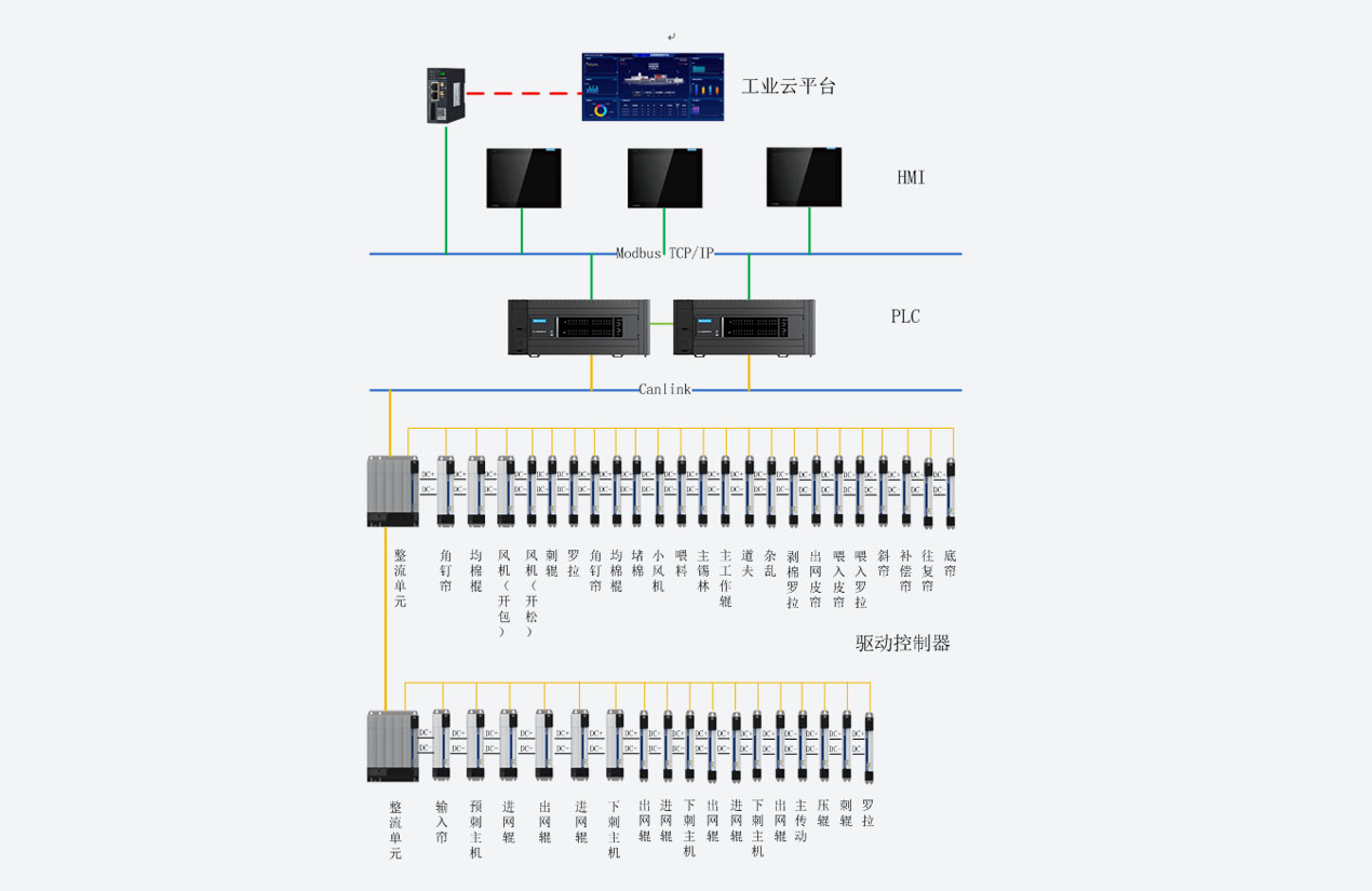 針刺線(xiàn)系統(tǒng)解決方案采用H3U+MD810的方案,采用CAN總線(xiàn)來(lái)連接。系統(tǒng)整體解決方案提高現(xiàn)場(chǎng)的設(shè)備的穩(wěn)定性,抗干擾性更強(qiáng)。同時(shí),采用共直流母線(xiàn)的電氣設(shè)計(jì)方案,實(shí)現(xiàn)梳理機(jī)的不斷網(wǎng),一鍵啟動(dòng)等功能。兼容遠(yuǎn)程物聯(lián)網(wǎng)功能,實(shí)現(xiàn)遠(yuǎn)程的設(shè)備調(diào)試,降低了設(shè)備的調(diào)試周期,提升維護(hù)性。