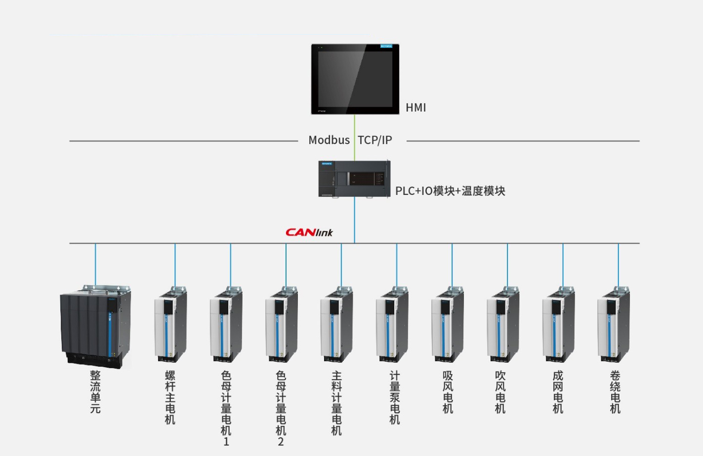 熔噴線系統(tǒng)解決方案采用H3U+MD810的方案,采用CAN總線來連接。系統(tǒng)整體解決方案提高現(xiàn)場的設(shè)備的穩(wěn)定性,抗干擾性更強。同時,變頻器采用矢量控制,低頻出力大。集成專業(yè)PID,風(fēng)壓控制更穩(wěn)定。專用張力控制系統(tǒng)算法,收卷控制更穩(wěn)定,張力波動1%。