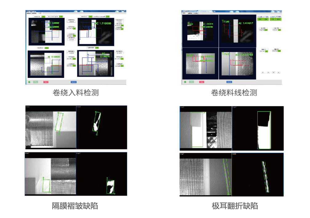 卷繞機是鋰電池成型的主要設備,通過驅動卷針將正負極片和隔膜按照特定的次序卷繞從而形成電芯,在此過程中,需使用視覺進行對齊度糾偏,同時識別相機視野范圍內的涂布、隔膜缺陷,以保證產品質量。為此,我司采用KINOVISION視覺檢測平臺對卷繞過程中的陰陽極距離和整體電芯的尺寸進行檢測,同時創(chuàng)新的采用深度學習的相關算法,實時檢測涂布和隔膜區(qū)的各類缺陷,提升產品質量,已經(jīng)批量應用于鋰電客戶。